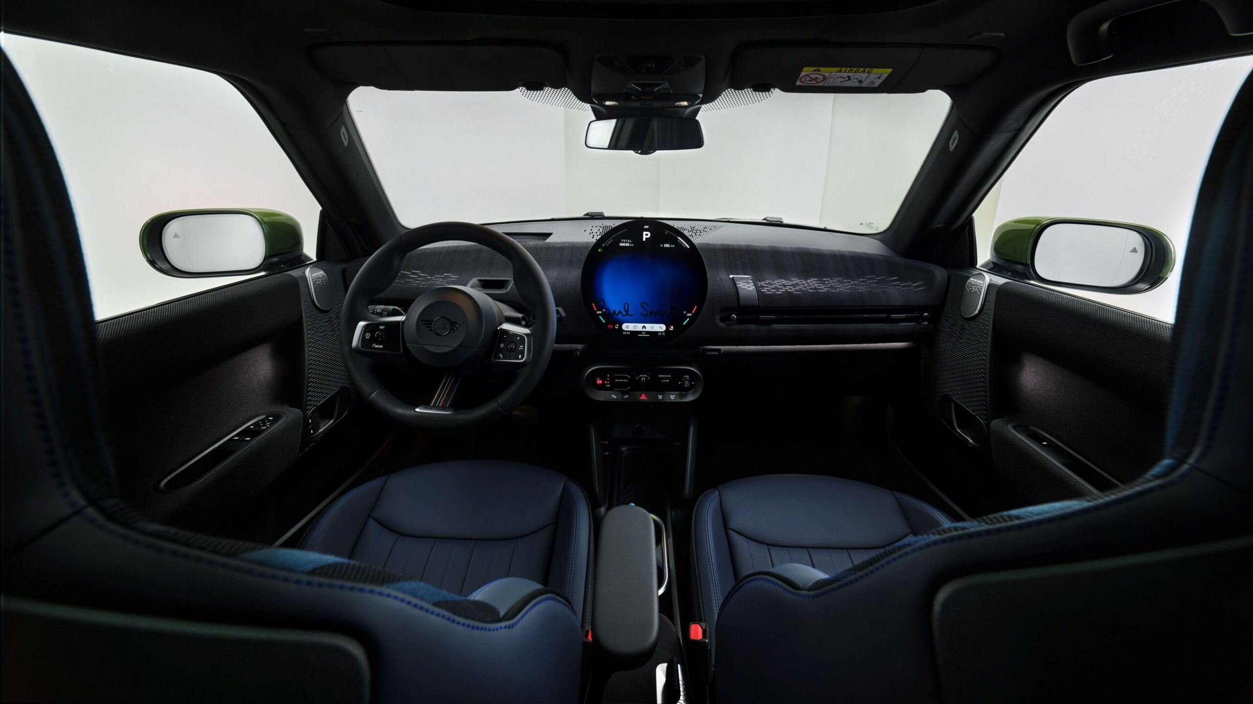 Binnenin ademt de Mini Paul Smith editie Britse elegantie met een moderne twist. Het interieur combineert zwarte gebreide oppervlakken met subtiele kleuraccenten, geïnspireerd op Paul Smiths kenmerkende strepen. De sportstoelen in Nightshade Blue zijn afgewerkt met gebreid textiel en felgekleurde sierstiksels op het stuur zorgen voor die herkenbare speelsheid.