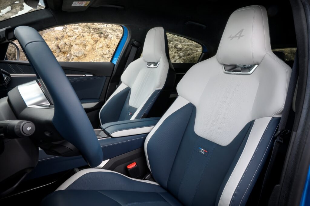 Het interieur van de Alpine A390 voelt erg luxueus aan en krijgt een design dat meteen doet denken aan de betere Renault-producten. Of nog beter: aan de boordplank van A290, die qua lay-out grotendeels dezelfde opstelling heeft. Je krijgt natuurlijk het typische Alpine sportstuur in handen, met de prominente rode OV-knop (van OverTake) waarbij je kortstondig een boost krijgt om in te halen, en ook de blauwe schakelaar om het niveau van recuperatie te kiezen.