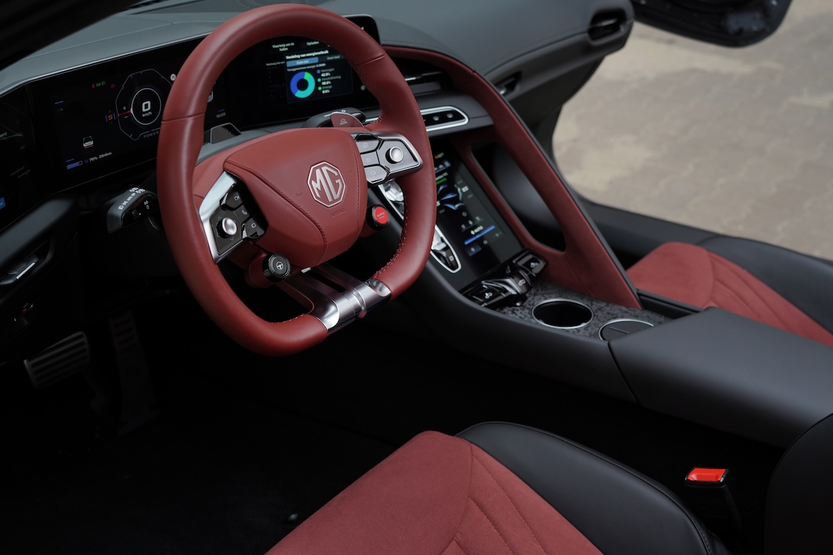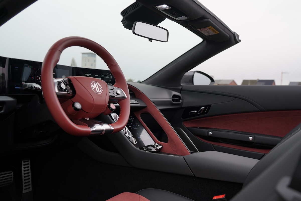De materialen combineren kunstleder en inzetstukken geïnspireerd op gesmeed koolstof, wat het interieur een bijna onverwachte verfijning geeft, zeker als je kiest voor de rode interieurkleur. De Y-vormige stoelen met zwevende hoofdsteunen weerspiegelen de wens om sportieve ondersteuning en comfort te combineren in een bijna sculpturale vorm. De digitale enscenering in de Cyberster blijft echter intuïtief: elke bediening ligt binnen handbereik, zodat het ontwerp niet alleen een decor is, maar een direct verlengstuk van de rijervaring.