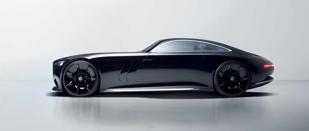 Voor het interieur heeft Mercedes gekozen voor een Art Deco-look. Het stuur lijkt meer op een roer van een schip, een truukje dat we ook al zagen op de DS N°8. Het oogt in ieder geval bijzonder én het ‘draait’ op steer-by-wire-technologie, dus zonder fysieke link tussen stuur en wielen. Het dashboard wordt de ‘Zeppelin’ genoemd en is uit glas gemaakt, waarin analoge en digitale instrumenten samenkomen. Het is echt een clash tussen retro en futuristisch aan boord, met knappe materialen als messing, velours en strofineer.