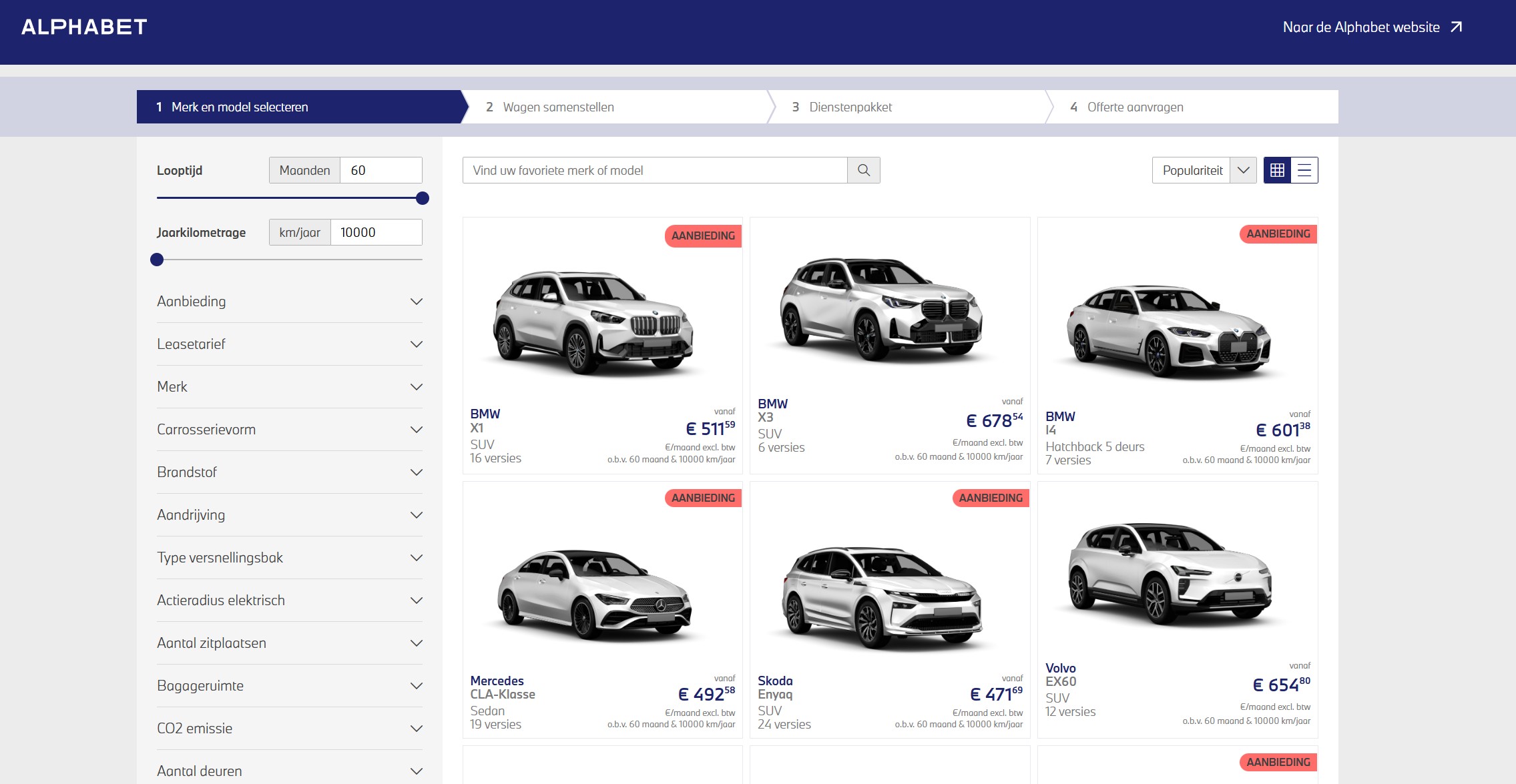 De configurator laat je onder meer een model en merk selecteren uit het uitgebreide aanbod, maar ook andere parameters zoals aandrijftype (elektrisch, hybride, benzine/diesel) en uitrustingsniveau. Verder moet je natuurlijk aangeven welke contractvoorwaarden je kiest zoals looptijd en jaarlijkse kilometers. Ook eventuele extra diensten die je in je leasepakket wil opnemen kan je toevoegen.