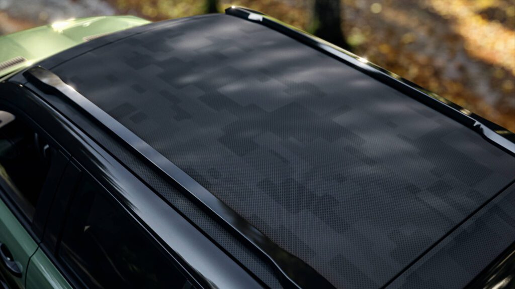Het exterieur van de Savane Concept spreekt boekdelen. De carrosserie is gespoten in de exclusieve kleur Jade Green, een tint die robuust oogt. Zwarte glanzende accenten op bumpers en wielkasten zorgen voor contrast, terwijl het dak – bekleed met een print van pixelvariaties – een subtiele camouflage-effect toevoegt. Nieuw zijn ook de 3D-geprinte schokabsorberende delen in de bumpers, die functionaliteit combineren met visueel vernuft.
