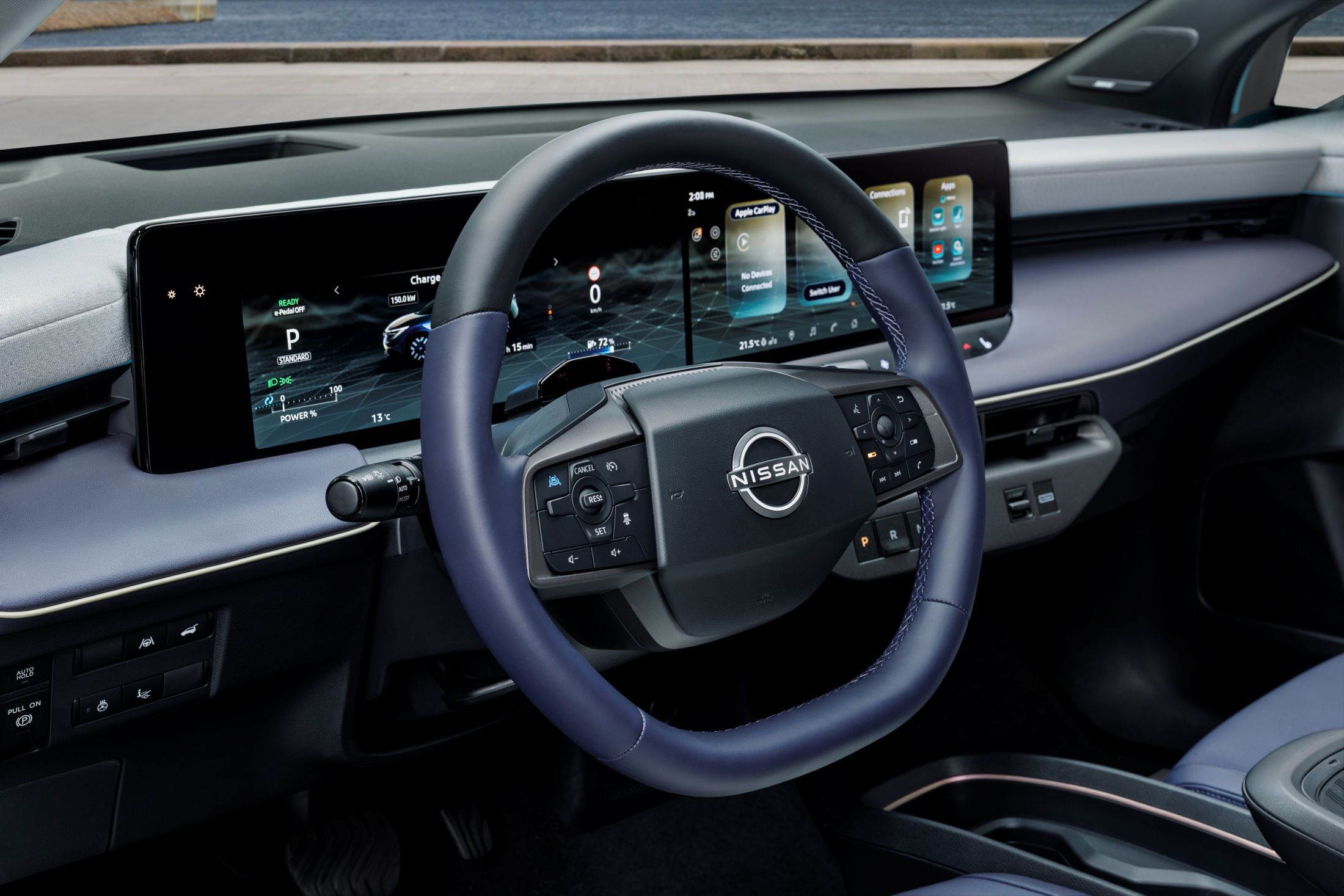 Het interieur oogt ook heel ‘keurig’, met materialen die behalve duurzaam ook van een hoogstaande kwaliteit lijken. Er is alweer geen enkele visuele verwantschap met de binnenkant van al dan niet elektrische Renaults, ze weten bij Nissan zelf ook nog wel hoe ze een interieur moeten ontwerpen. Voor de digitale instrumenten en het infotainment zijn er twee zowat naadloos op elkaar aansluitende schermen van 14,3 duim, op het tweede zorgen Google Maps en heel wat van smartphones bekende apps meteen voor een vertrouwd gevoel. Apple CarPlay en Android Auto kunnen natuurlijk ook draadloos worden gebruikt, er is voor onder meer het (vooraf) uitstippelen van routes ook nog een leuke Nissan-app. De fysieke knoppen op de middenconsole en het stuurwiel maken ons helemaal goedgezind, met het (vaste) panoramadak met Solarbay-gewijs (van dan wel Renault) een variabele transparantie blijven we dat ook. Esthetisch iets minder geslaagd vinden we de grote knoppen voor het kiezen van de rijrichting, die lijken zowat op de middenconsole ‘gegooid’.