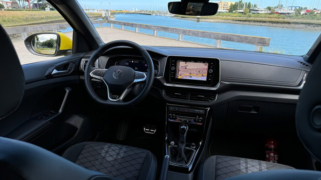 De Volkswagen T-Cross komt vanaf nu met een 8” of 10” infotainmentsysteem dat “bovenop” het dashboard prijkt ipv ingewerkt is. Dit uitgebreide systeem met hedendaagse functionaliteit en logische opbouw komt steevast in combinatie met een digitaal instrumentenpaneel (9,2”). Qua materiaalgebruik ging de compacte SUV er op vooruit maar het blijft bij een mix van allerhande (harde/glimmende) materialen, de afwerking staat naar goede Duitse gewoonte op punt. Al moet je wel goed kunnen swipen/strelen om de gewenste temperatuur te bekomen, dat doet de basisversie met klassieke draaiknoppen toch beter.